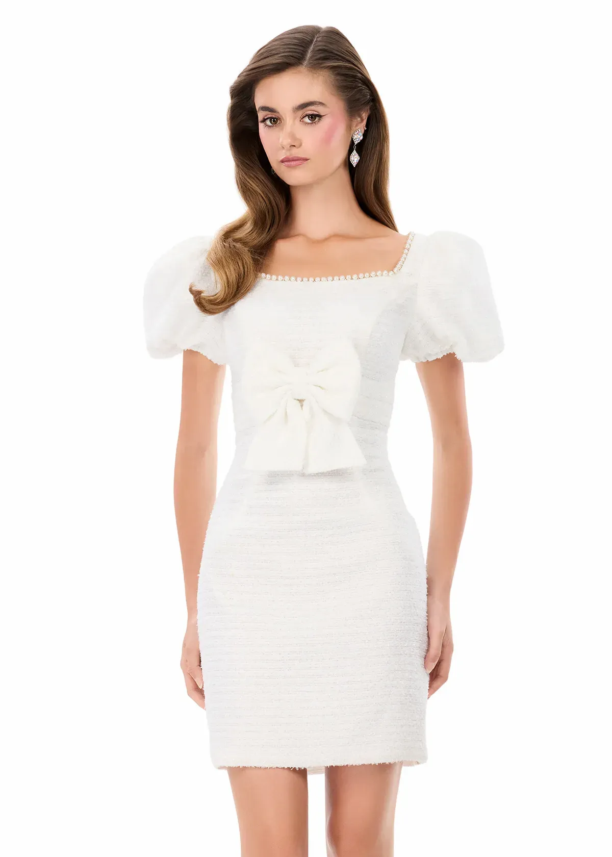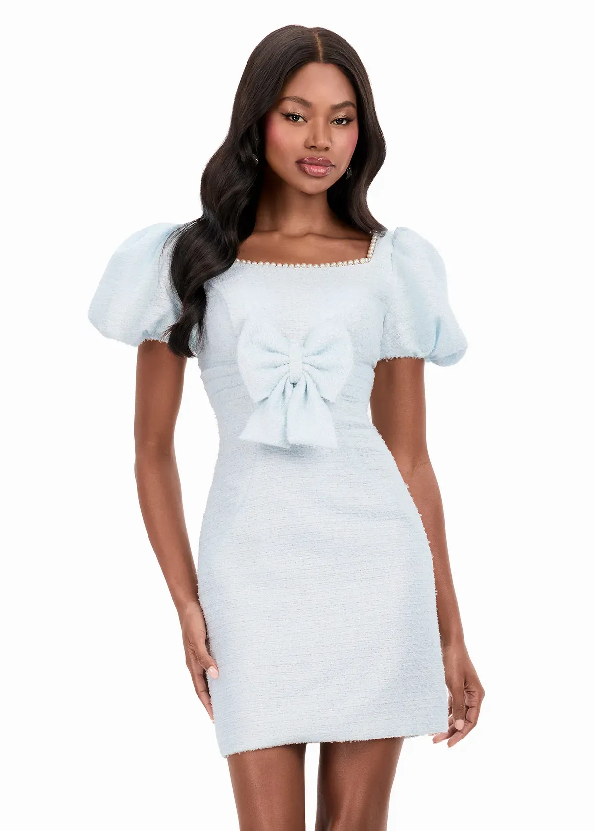 Bright, bold, and irresistibly sweet! This style delivers the perfect blend of charm and sophistication. ASHLEYlauren Style 4970 is a tweed mini dress featuring delightful puff sleeves, a flattering square neckline, and a statement bow that adds a playful touch. Crafted in textured tweed, this silhouette offers structure while maintaining a feminine, flirty vibe perfect for standout moments.