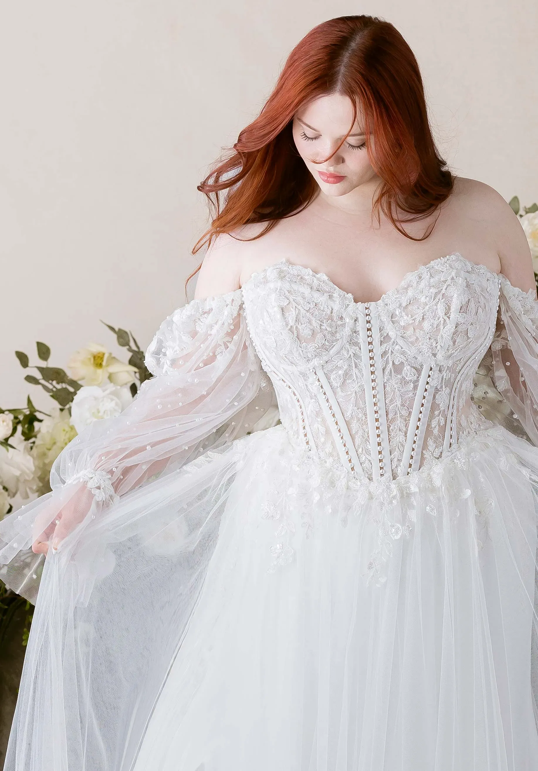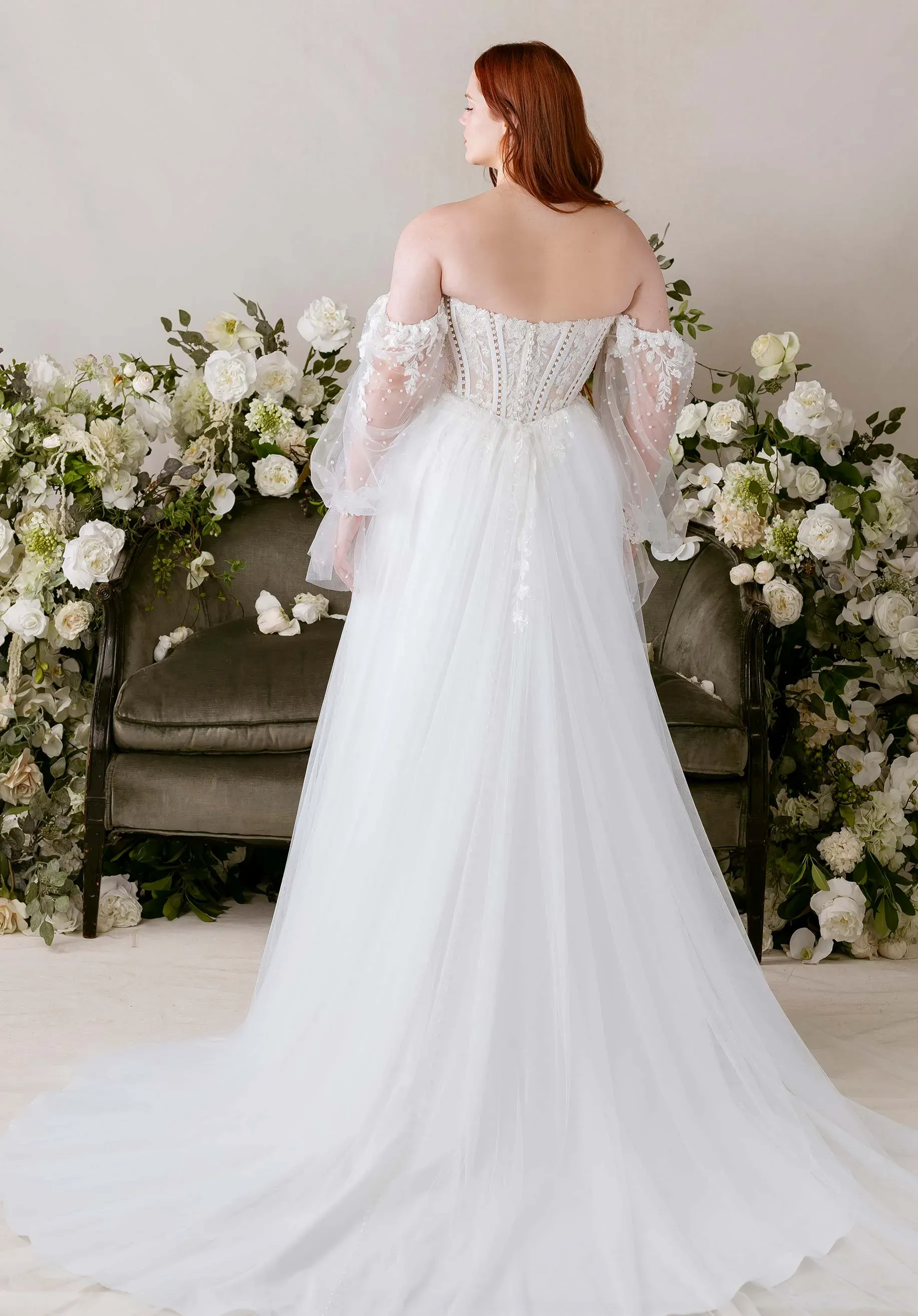 Our Tesoro wedding dress captures the art of movement in a moment of stillness. The fit and flare silhouette glides with quiet grace, featuring a boned bodice adorned with beaded floral appliqués and luminous pearl accents that trace the form like soft light. The crepe skirt flows effortlessly, creating a sense of weightless elegance, while detachable long sleeves and a sheer tulle overskirt add depth and fluidity, transforming the look from sculpted sophistication to ethereal romance.