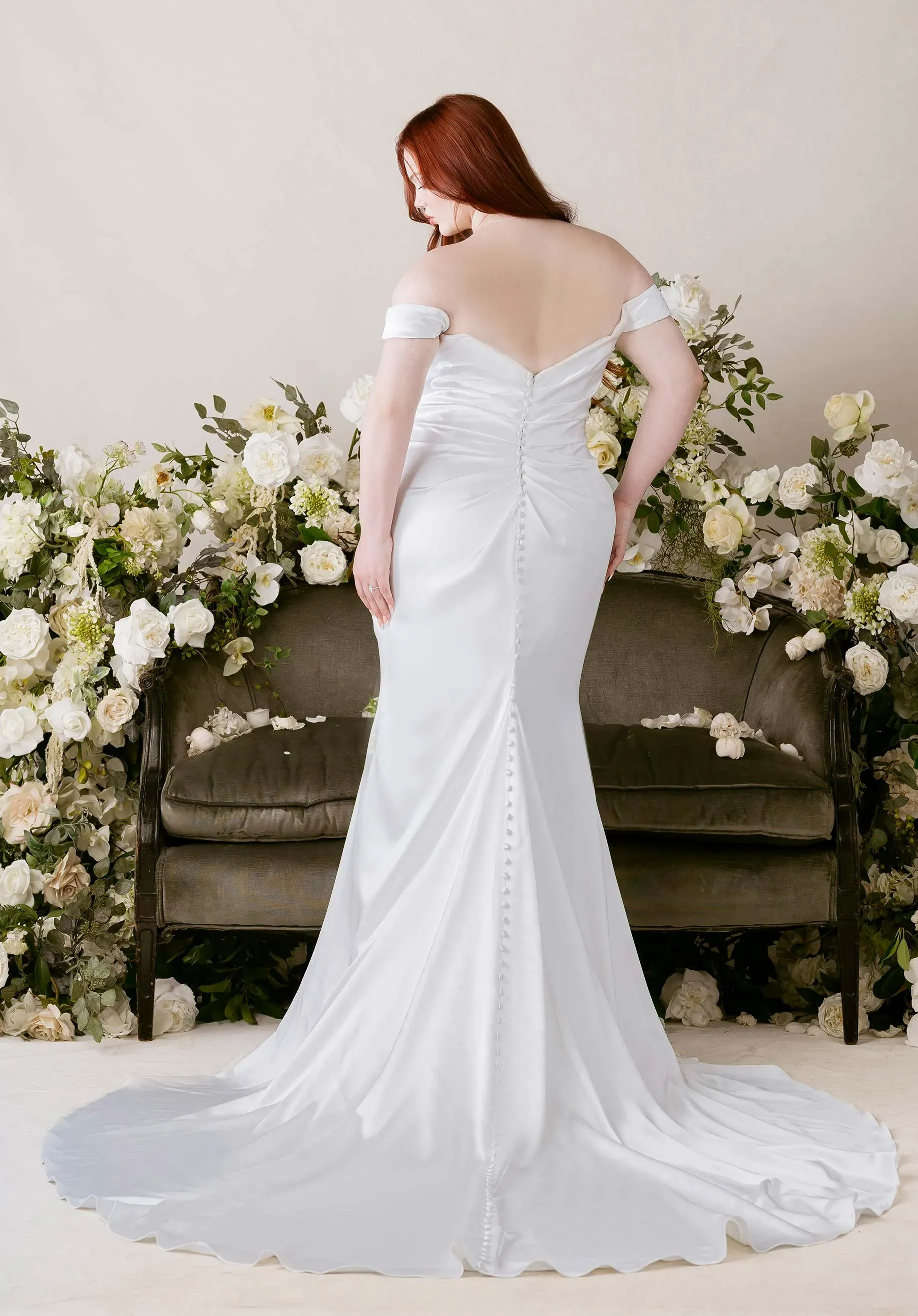 Softly sculpted and effortlessly graceful, our Canna wedding dress moves with the poise of a dancer in motion. The off-the-shoulder sweetheart neckline frames the décolletage with gentle allure, while a draped bodice sculpts the torso with refined fluidity. A subtle skirt slit adds movement and a hint of drama, allowing the silhouette to glide with graceful ease. Light, poised, and timelessly chic, the gown balances structured elegance with an airy, romantic sensibility.