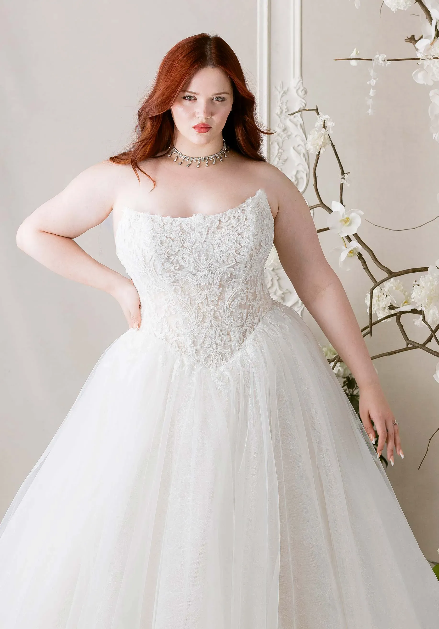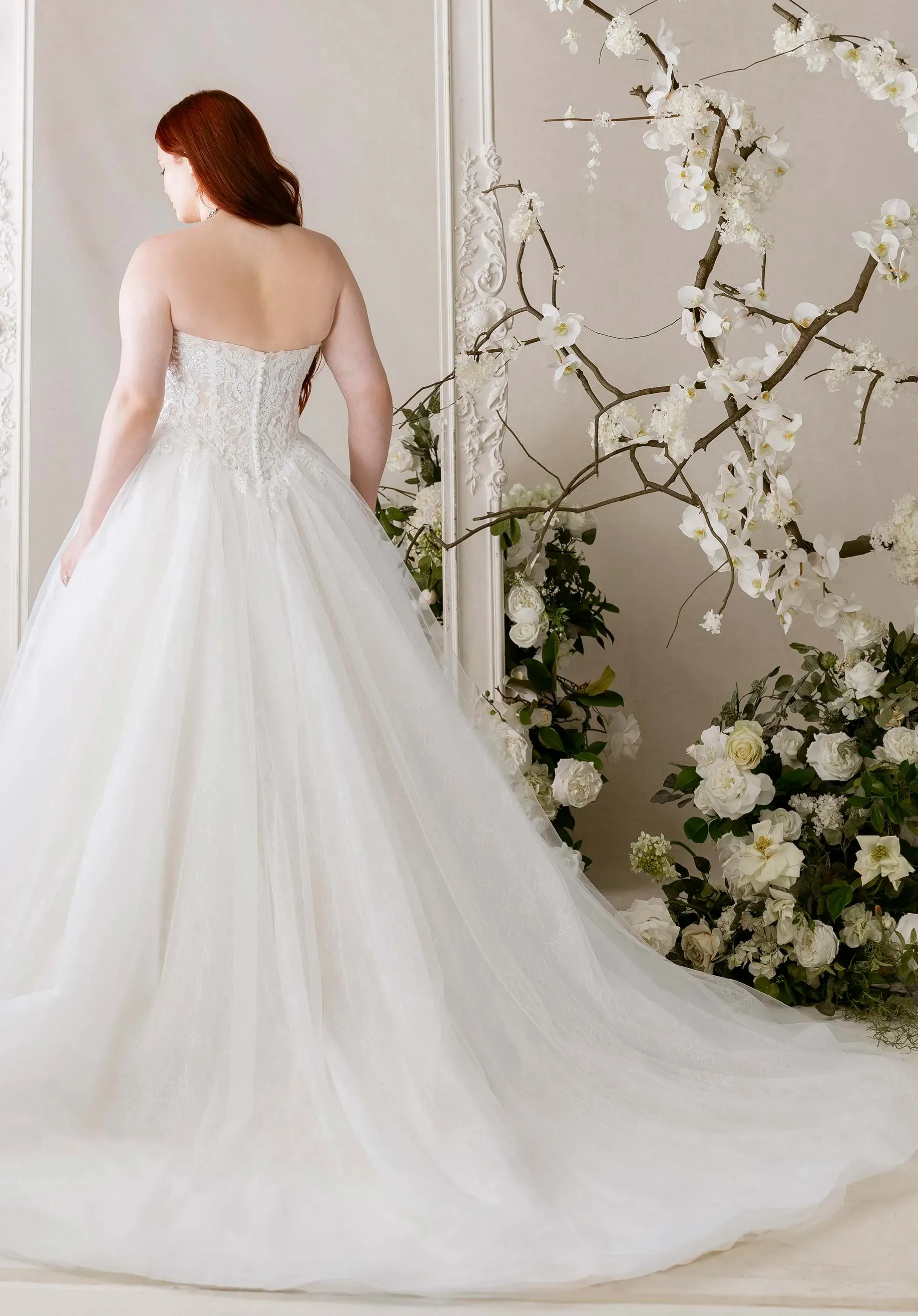 Ethereal, timeless, and effortlessly enchanting, our Meli wedding dress is a vision of elegance. The soft scoop neckline frames the décolletage, adorned with baroque-inspired beaded lace that shimmers with every turn. Detachable off-the-shoulder tulle sleeves float lightly over the arms, adding a whisper of airy romance, while the basque waist bodice sculpts the torso with grace. Layers of tulle over Chantilly lace compose a skirt that drifts and sways with fluid motion.