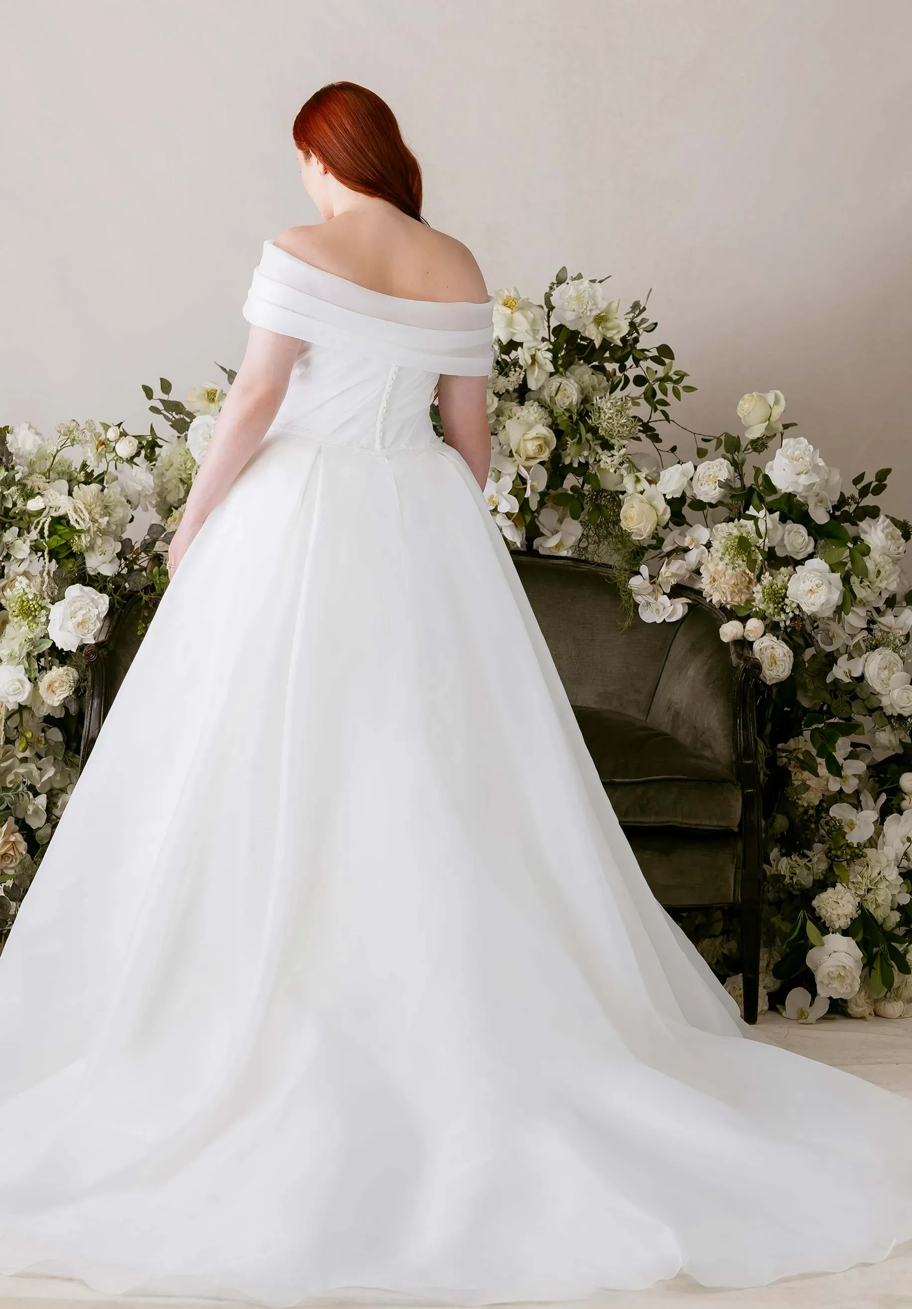 Our Alora wedding dress evokes quiet luxury, timeless, feminine, and impossibly refined. The strapless, straight neckline and artfully draped bodice create a sculpted yet effortless silhouette, while the detachable off-the-shoulder stole, finished with jeweled brooch accents, lends a touch of couture drama. A removable crystal belt cinches the waist in luminous detail, enhancing the fluid sheen of the satin organza. The result is a gown that glides like a glissade step.