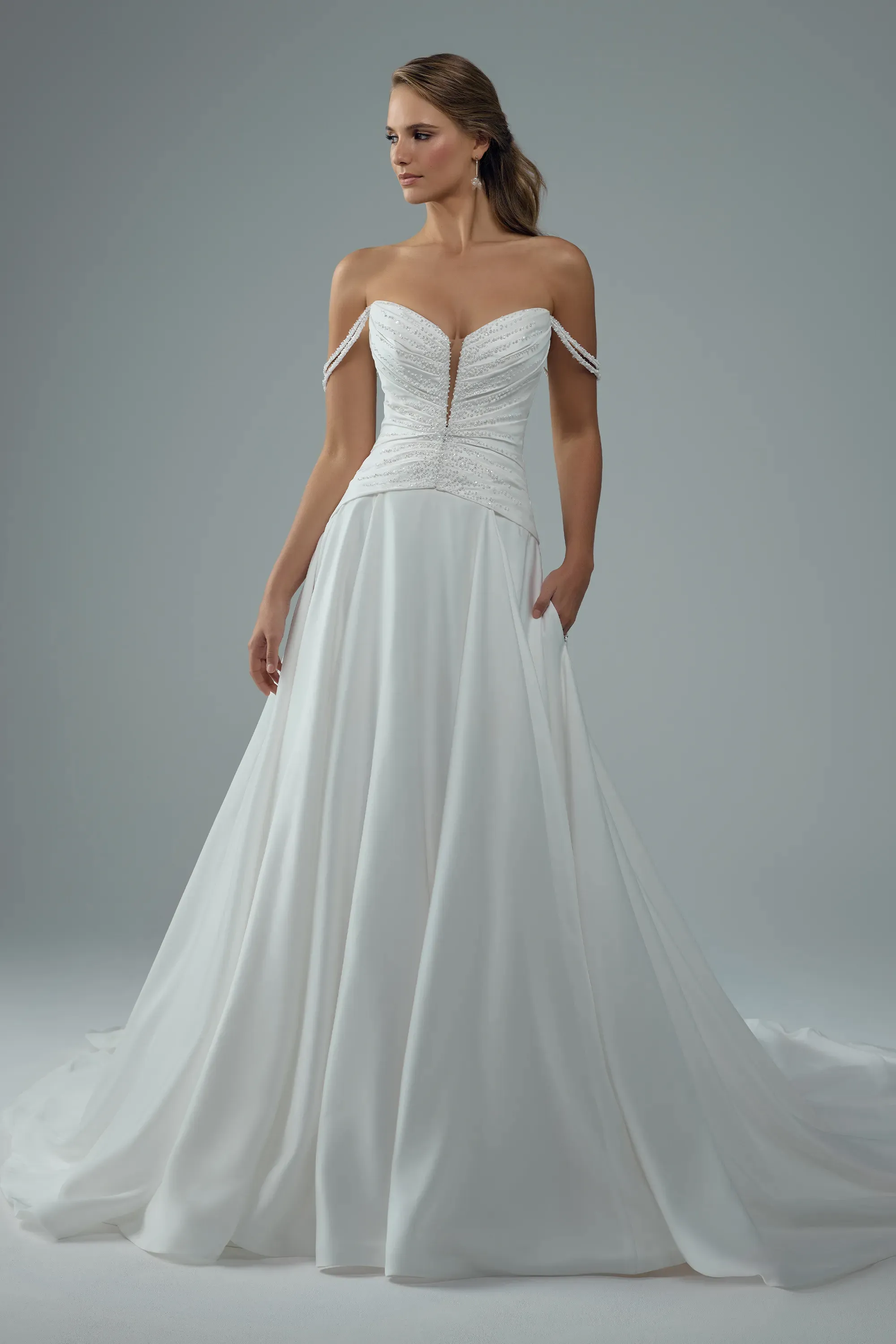 Maple is a vision of softness and grace, designed for the bride who dreams of effortless beauty. Crafted from luxurious satin, her A-line silhouette features a plunging V-neckline framed by delicately beaded off-shoulder straps that add just the right amount of shimmer. Subtle draping across the bodice is carefully embellished with beading, both front and back, creating texture that catches the light in the most elegant way. Her flowing satin skirt falls gently from the waist, offering both ease of movement and timeless appeal. The beaded off-shoulder straps are also detachable, giving you the option to transform your look into a strapless beauty. Maple is stunning from every angle and she?s waiting to be part of your love story.